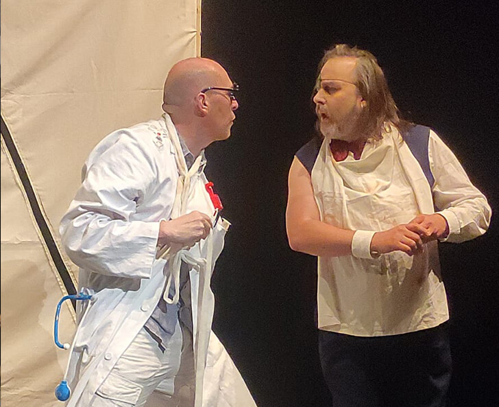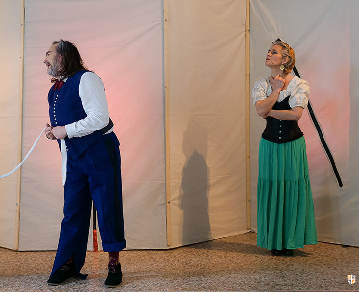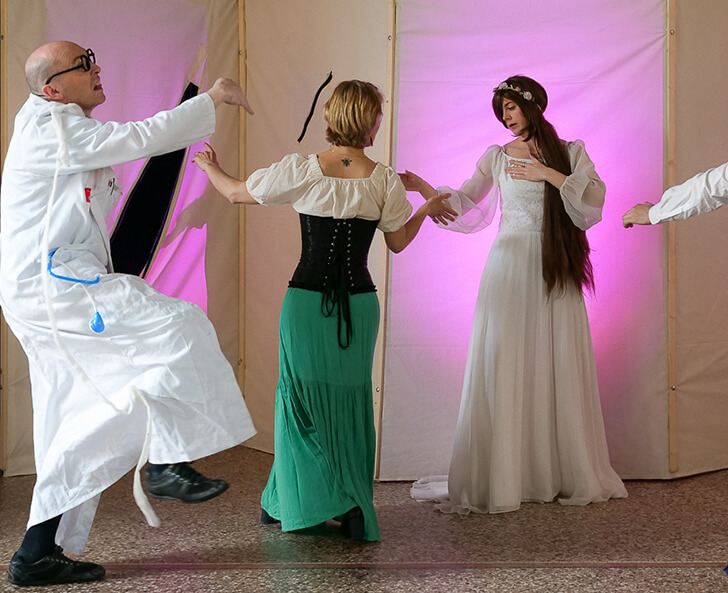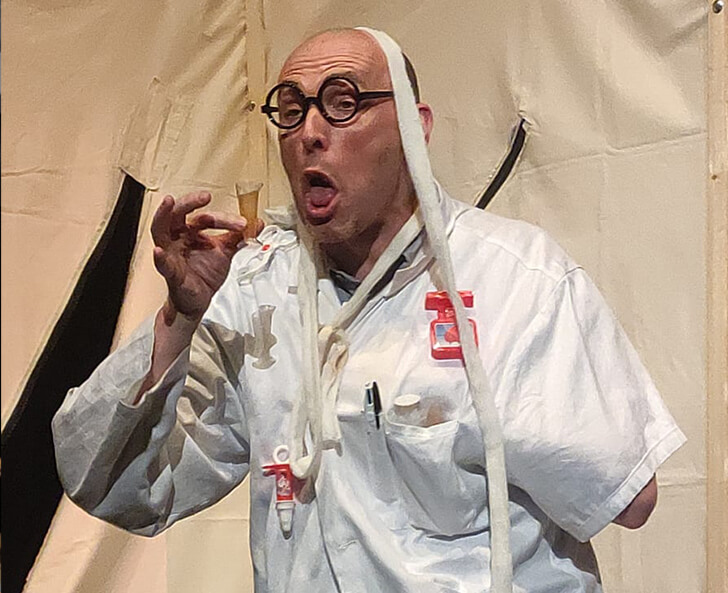 le roi. Texte issu d’un des nombreux canevas de la comédie italienne, sa thématique dénonce le charlatanisme des personnes se défendant d’appartenir au corps médical et fait la part-belle à la bêtise humaine. Le jeu aborde le mime et l’espace, la place du comédien dans la cité.